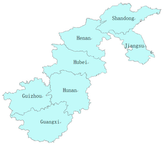 According to the selection criteria mentioned above, seven major provinces that were included in every survey were chosen in our study: Jiangsu, Shandong, Henan, Hubei, Hunan, Guangxi, and Guizhou. Furthermore, according to the geographical location, the surveyed provinces were categorized as Eastern China (Shandong, Jiangsu), Central China (Henan, Hubei, Hunan), and Western China (Guizhou, Guangxi) (Figure 1).