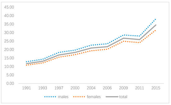 In total, 70,374 records of 21,006 individuals aged 12 years and over were included in our study, of which 47.5% were males. From 1991 to 2015, the prevalence of hypertension in China increased from 11.7% to 34.5%, with a higher rate in males than that in females (increased from 12.8% to 38.1% vs. 10.8% to 31.5%, respectively).