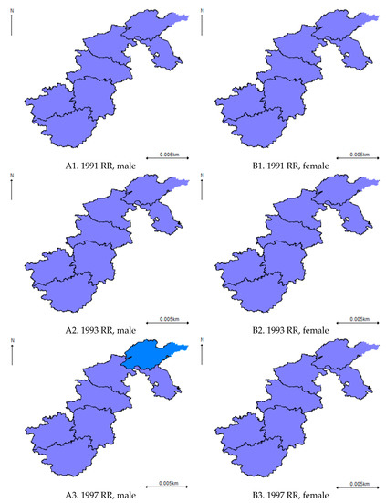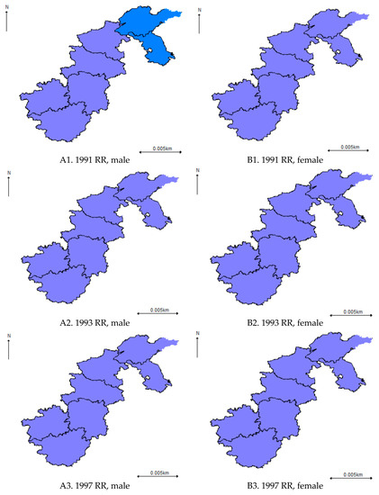 In terms of the temporal effects derived from the spatio-temporal SCM, there existed a declining trend of the hypertension risk between 1991 and 1993 because there was negative gender-specific temporal effect during this period for both males and females. However, after 1993, an upward trend was observed for males with an abrupt increase in 1997, yet the increase became steady after 2000, and no significant effects was observed for females after 1993 (Figure 9). Thus, gender-specific hypertension prevention and control should be considered in the future, and special attention should be paid to males if no effects of regional covariates are taken into account.
