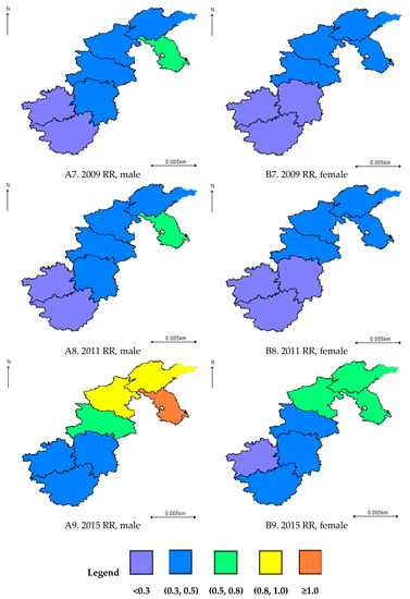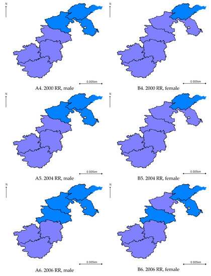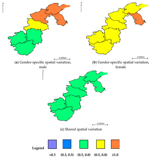 This study was motivated by the fact that most disease mapping studies focused on rare diseases in spatial dimensions [13,14,15,16,17,18] although utilizing both spatial and temporal information can provide more insight into disease pathogenesis. What is more, previous hypertension studies were conducted at the individual level, which may have neglected the potential correlation between individuals in spatial or temporal dimensions. Therefore, in this study, we attempt to incorporate both spatial and temporal information into the spatial Besag, York, and Mollie (BYM) model and the Shared Component Model (SCM) to explore the variation and evolution of gender-specific hypertension risks in both single-disease and multiple-disease settings. By conducting the spatio-temporal analysis, the spatio-temporal variation of gender-specific hypertension risks can be better depicted, thus providing us important clues to investigate the potential gender-specific hypertension risk factors at regional levels.