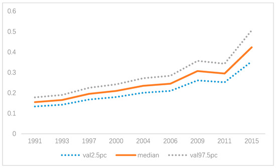 In terms of the spatial effects derived from the spatio-temporal SCM, it suggested that the gender-specific variation played a major part in the overall spatial variation of the hypertension risk with a clear spatial pattern. In particular, a higher hypertension risk was observed in Jiangsu, Shandong, and Henan for males and Jiangsu for females (Figure 7a,b). In contrast, the overall shared spatial variation (Figure 7c) was at a medium size (Posterior mean < 0.8) with no significant spatial pattern. However, an upward trend was observed for the weight (δ) of the overall shared spatial variation over time, which indicated that the common hypertension risk factors played a more and more important part for males and females, even though the contribution of the shared hypertension risk factors was no more than 30% before 2009 (Figure 8).