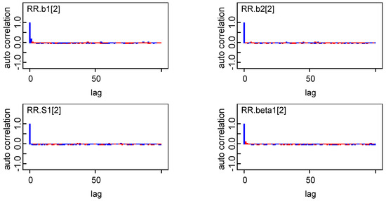 For brevity, Figure 10 only presents the autocorrelation results for b1, b2, S, and β when i = 2, the results of other parameters can be obtained upon request. Note that S1 [2] means the gender-specific temporal effects in 1993 (Year No.2) and beta1 [2] means spatio-temporal interaction effects for area No.2 in year No.1 (that means Hunan province in 1991).