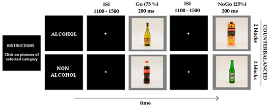 After general instructions were given, the Go matching category (alcoholic or nonalcoholic) was displayed on the screen. In the alcohol condition (Go-Al), pictures of alcoholic (Al) drinks (wine, beer, or liquor) were defined as Go stimuli and pictures of nonalcoholic (NoAl) drinks (water, soft drinks, and milk) were defined as NoGo stimuli. The assignation was reversed in the nonalcohol (Go-NoAl) condition. Subjects were required to respond as quickly and accurately as possible to Go stimuli (by pressing the left-hand button on the mouse with the dominant hand) and to omit any response to NoGo stimuli. A brief practice block was run before the recording to ensure that participants understood the instructions and were familiar with the task. The picture set was designed to include drinks representative of Spanish consumption habits and represented both active (people drinking) and passive (bottle on a tray) images, following the same criteria as in the Amsterdam Beverage Picture Set (ABPS) [69].