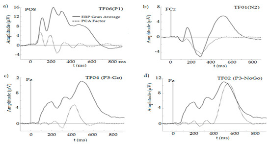 Graphical plots of the main ERP components identified: (a) TF01, P1; (b) TF01, N2, (c) TF04, P3-Go, (d) TF02, P3-NoGo, Grand average (solid line) versus PCA factor (dashed line) is shown for each component at the location of the maximum peak.