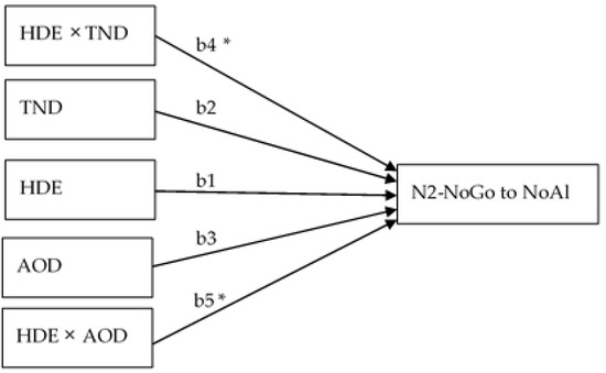 Diagram of the moderation model (model 2 from process): The two moderator variables considered in the model (total number of drinks in the last 180 days (TND) and age of onset of drinking (AOD)) interacted with the predictor variable (BDE) to explain the relation with the dependent variable (N2 NoGo to NoAl stimuli amplitude). BDE: binge drinking episodes in the last 180 days; TND: total number of drinks in the last 180 days; AOD: age of onset of drinking; b: regression coefficients; * p < 0.05.