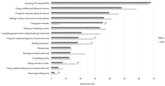 Total duration (minutes/day) of home-based sitting behaviours by sex. * Significant differences between boys and girls determined by independent samples t-tests, p < 0.05.