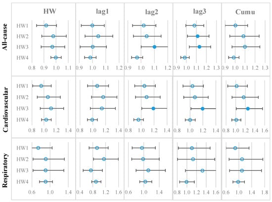 Relative risks (RRs) of all-cause, cardiovascular, and respiratory mortalities on heatwave days and 1–3 lagged days. Note: Each dot indicates the mean RR, and the error bar indicates the 95% confidence interval (CI). A solid dot denotes that a mean RR is greater than 1 and statistically significant, and an empty dot denotes that a mean RR is statistically not different from 1.
