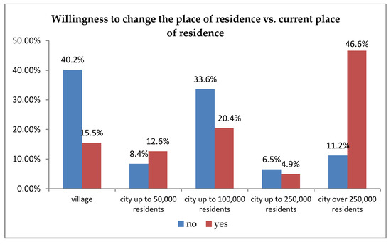 To check the nature of the occurring differences, an additional post hoc analysis was carried out taking into account the method by Baesley and Schumacker [34]. The conducted analysis showed that people living in villages and cities of up to 100000 residents are less willing to change their place of residence. People living in cities of over 250000 residents are more likely to change their place of residence. It may result from stronger social ties connecting residents in smaller territorial units and also, to some extent, from the greater wealth of larger city residents [37].