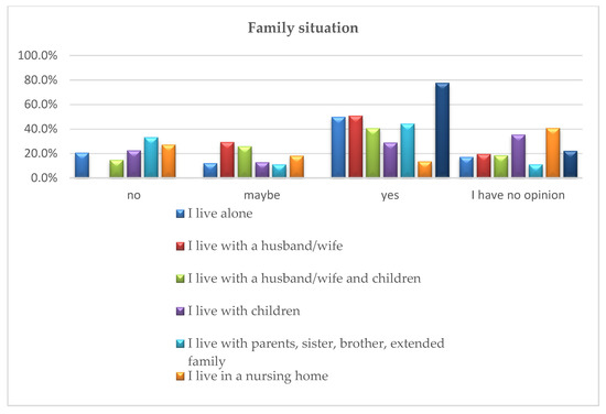 The answer “no” did not prevail in any of the analysed groups. The highest percentage of negative responses were provided by those living with their parents, sister, brother, extended family (33.3%), and also in the group living in a nursing home (27.3%). At the same time, those living in nursing homes answered “yes” the least often out of all the studied groups (13.6%) and most frequently had no opinion (Figure 4).