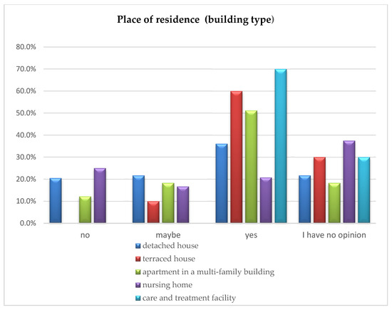 In the conducted research, the primary focus was on the analysis of the respondents’ willingness move from an apartment/house to an apartment/house that is adapted to the needs of senior citizens, depending on the current place of residence. For this reason, the analysis using Pearson’s chi-square test of independence was carried out to verify whether the analysed respondents were willing to change their place of residence and purchase an apartment adapted to their mobility needs depending on where they currently reside. The analysis showed significant differences between the compared groups (χ2 (4) = 38.90; p < 0.001; v = 0.43). Figure 2 illustrates the percentage comparison of the answers provided by the respondents.