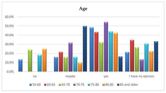 For the respondents’ opinions regarding the need to develop special housing offers for seniors depending on their age, the chi-square test of independence did not show significant differences χ2 (18) = 25.68; p = 0.107. In all age groups, except for people aged 85 and older, the opinion “yes” prevails. This exception is most likely due to the fact that the oldest people no longer see the possibility or need to change their place of residence. Figure 6 shows the respondents’ answers depending on age.