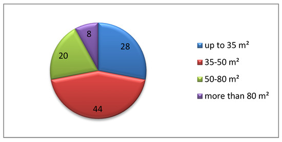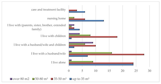 People living alone preferred an apartment square footage of up to 50 m2 (the total of 48 indications). Spouses without children showed the greatest interest in the footage ranging from 35 to 50 m2 (28 indications) and also from 50 to 80 m2 (16 indications). Those living with a spouse and children or living with children would choose larger apartments. Seniors staying in nursing homes and also in care and treatment facilities were predominantly interested in small apartments (Figure 8).