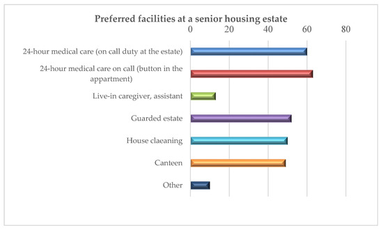 Based on the opinions presented by seniors, it was established that the most popular facilities were as follows: 24 h on-call medical care (button in the apartment) and 24 h medical care (on-call duty), i.e., 63% and 60% of the population, respectively. For half of the respondents, safety is very important because they chose an apartment in a guarded estate. The same number of respondents indicated the possibility of using a canteen and house cleaning (Figure 9). Among “other” preferred facilities, the following were listed: a restaurant (six indications), a snack bar specializing in dairy products, a park (two indications each) and a swimming pool (one indication).