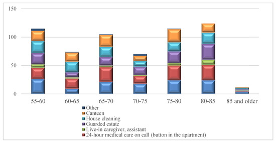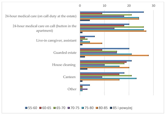 The respondents aged 80–85 indicated the greatest demand for various facilities (124 indications). The majority of needs referred to a guarded housing estate (28 indications), 24 h on-call medical care (button in the apartment) (27 indications), 24 h medical care (on-call duty at the estate) (24 indications) and house cleaning (20 indications). The age groups 55–60 and 75–80 presented the same number of indications (115) and very similar preferences (Figure 9). Their most frequent choice was 24 h medical care (on call duty) (26 and 24 indications respectively), 24 h medical care on call (button in the apartment) (20 and 26 indications), guarded housing estate (20 and 21 indications), house cleaning (21 and 16 indications) and a canteen (18 and 23 indications). The importance of the aforementioned facilities for senior citizens is confirmed by the data collected within the framework of the study conducted in Poland in 2014, in line with Eurostat guidelines as part of the European Health Interview Survey (EHIS) [41]. The studies have shown that over 2,000,000 people aged 65 and older (34% of the total population) had limitations in performing basic daily activities—of which, 200,000 people had mild limitations, 1,311,000 had moderate limitations, and 504,000 people had severe limitations. The possibility of everyday independent functioning declines with age. In the age group 65–69, every fifth respondent had problems; among seventy-year-olds, almost every third respondent had problems; and in the oldest age group (80 or older), more than every second person had problems (58%). Most frequently, ailing people or those in poor health had problems in their daily functioning, which was more often signalled by older women than men. The limitations they suffer do not allow them to do heavy housework; over 57% of the respondents aged 65 and older indicated difficulties in performing such activities. Doing everyday shopping was a problem for every third elderly person, to be followed by difficulties in performing less demanding housework or taking care of financial matters and everyday administrative issues. The scale of health limitations in running a household is confirmed by the following numbers. It is estimated that 1,100,000 seniors found it difficult to prepare meals, over 810,000 had problems using their landline phone, 2,100,000 people doing daily shopping, and over 800,000 preparing and taking medicines. The scale of needs regarding this basic aspect of human life can be demonstrated by the fact that almost 45% of seniors have problems with taking basic care of themselves and have to cope on their own because they are not provided with any assistance [42].