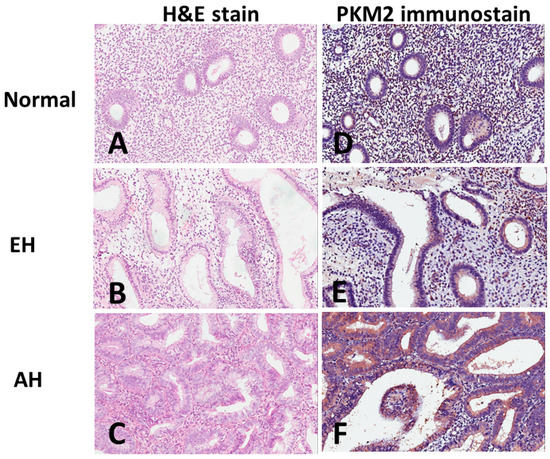 Examples of hematoxylin and eosin (H&E) staining of (A) normal endometrium, (B) endometrial hyperplasia without atypia, (C) atypical hyperplasia and pyruvate kinase M2 (PKM2) immunostaining of (D) normal endometrium, (E) endometrial hyperplasia without atypia, (F) atypical hyperplasia.