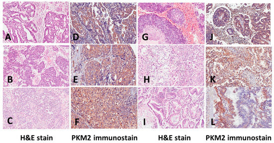 Examples of hematoxylin and eosin (H&E) staining of (A) grade 1 endometrioid adenocarcinoma, (B) grade 2 endometrioid adenocarcinoma, (C) grade 3 endometrioid adenocarcinoma, (G) serous carcinoma, (H) clear cell carcinoma, and (I) mucinous carcinoma and pyruvate kinase M2 (PKM2) immunostaining of (D) grade 1 endometrioid adenocarcinoma, (E) grade 2 endometrioid adenocarcinoma, (F) grade 3 endometrioid adenocarcinoma, (J) serous carcinoma, (K) clear cell carcinoma, and (L) mucinous carcinoma.