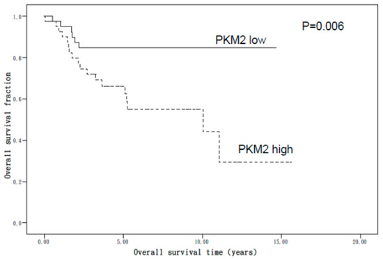 Kaplan–Meier analysis of survival in patients with endometrial carcinoma (EC) based on pyruvate kinase M2 (PKM2) protein immunostaining. Patients with a higher PKM2 score had a poor overall survival compared with those with a lower score in all patients with EC (p = 0.006).