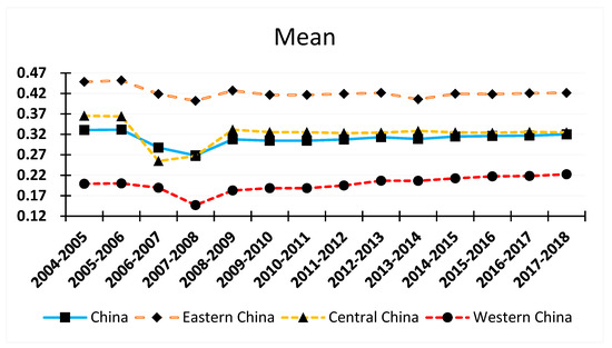 This study used 31 provinces in China as research subjects and employed the entropy method to measure HCR concentration between 2004 and 2017. The average values for HCR concentration at the regional and national levels are presented in Figure 1. As per the findings, trends in changes of regional (eastern, central, and western regions) and national averages of HCR concentration were similar during the period of observation. The HCR concentration at regional and national levels showed a decreasing trend between 2004 and 2007; after increasing drastically in 2008, HCR concentration remained reasonably high thereafter. These changes may be due to the following reasons: In 2004, hospital reforms targeting “commercialization” were implemented, thus HCR concentration increased in 2004. Between 2005 and 2007, the argument that “commercialization is not the correct direction for healthcare reform” emerged, and the government undertook costs of basic public healthcare, thus HCR concentration dropped significantly. With the issuance of “Opinions on Deepening the Reform of the Medical and Health System (Draft for Comment)” by the State Council on 14 October 2008, a new round of healthcare reforms was officially launched. Provinces and municipalities reinforced the reform of the healthcare system and increased financial support from the government. As a result, the situation in medical and health institutions was greatly improved, and HCR concentration in the provinces increased. Across the board, it can be seen that the HCR concentration of provinces in the eastern region was the highest, and greater than that of the national average; the HCR concentration of provinces in the central region did not differ much from the national average, but was slighter higher than the national average; the HCR concentration of provinces in the western region was the lowest, with the concentration level showing a slight increase over time. These findings were consistent with differences in the overall economic development among regions.