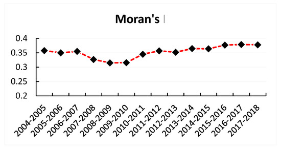 In the context of regional economic integration, theoretically speaking, there should be a spatial correlation between the HCR concentrations of different provinces and cities. Therefore, the MATLAB2016a software package was used to calculate the global Moran’s I of HCR concentration in China from 2004 to 2017 (Figure 2). As presented in Figure 2, the global Moran’s I of HCR concentration in China was positive, indicating that the HCR concentration levels between provinces were positively correlated, and suggesting that provinces with a high HCR concentration tended to cluster together, while those with a low HCR concentration agglomerated together. In addition, the chart also demonstrated that spatial correlation of HCR concentration in China experienced a trend in which a decline was followed by an increase. Specifically, there was a noticeable decreasing trend in spatial correlation coefficients from 2007 to 2009. Such a decline could be due to the fact that the years between 2007 and 2009 were the first three years of implementation of the new healthcare reforms, during which reforms were still undergoing an exploratory phase, and provinces were attempting to determine appropriate paths to achieve the national goal given the current situations of their own healthcare systems; hence, the degree of correlation of HCR concentration between provinces declined. Thereafter, with further implementation of reforms, provinces began to exchange accumulated experience and successful practice with each other, which in turn facilitated the increase of the degree of spatial correlation of HCR concentration in China.