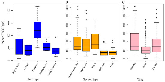 Comparison of indoor total volatile organic compounds (TVOC) concentrations by store type, store section type, and time. (A) Comparison by store type; (B) Comparison by section type; and (C) Comparison by time. The midline of a box is the median of the data, and the upper and lower limits are the third and first quartiles, respectively. The whiskers extend 1.5 times the interquartile range from the box, and dots represent individual data points as outliers.