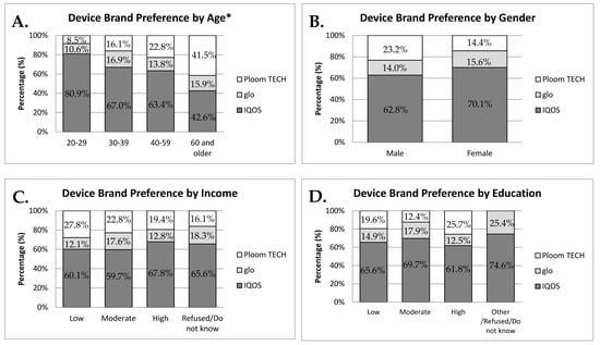 HTP device brand preference by various demographic characteristics. (A) Age; (B) gender; (C) annual household income; (D) education. The values represent a weighted percentage. * p < 0.001 (Rao–Scott chi-square tests).