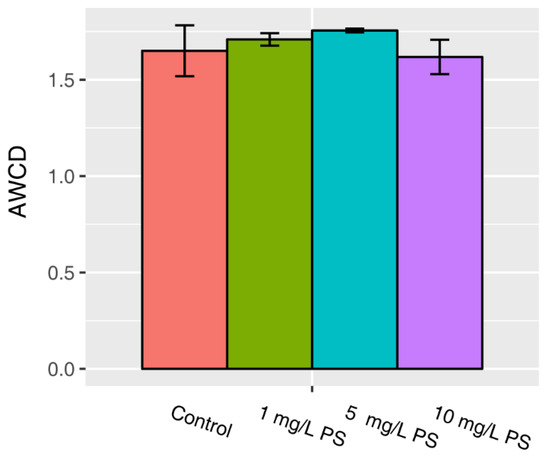 Average well-color development (AWCD) of all carbon sources. No significant difference (p > 0.05) was observed between the PS-introduced groups and the control.