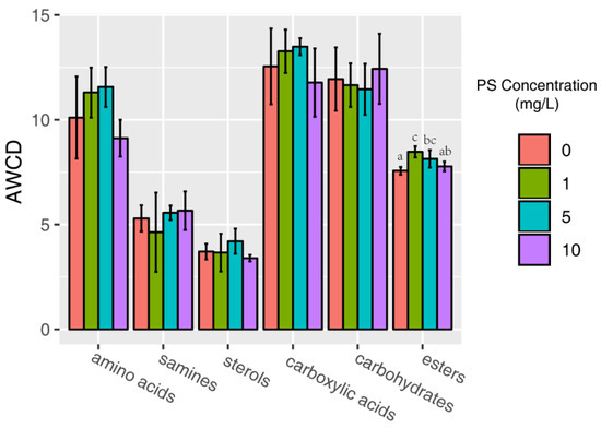The changes in the carbon sources of the periphyton are displayed in Figure 4. The chart reports that the carbon source utilization ratio by biofilms varies dramatically both for different carbon sources and aquatic environments treated with different PS particle concentrations. The dividing carbon source utilization ratio in this investigation was 4% [41].