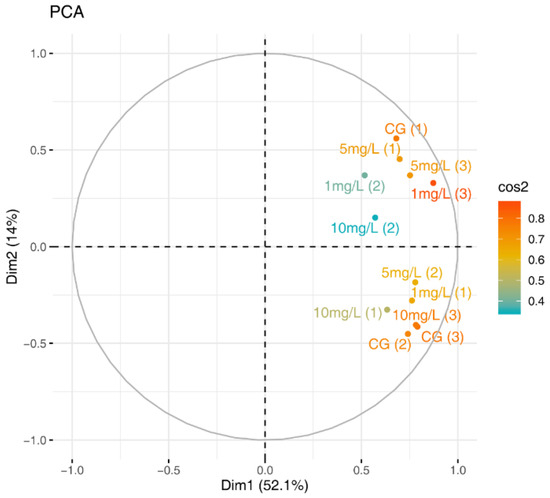 Nanoplastic (NP)-introduced aquatic PCA ordination showing the microbial community carbon source utilization patterns (CSUPs). CG represents the control group. The cos2 values are used to estimate the quality of the representation. The closer a variable is to the circle of correlations, the better its representation on the factor map and the more important it is for interpreting these components.
