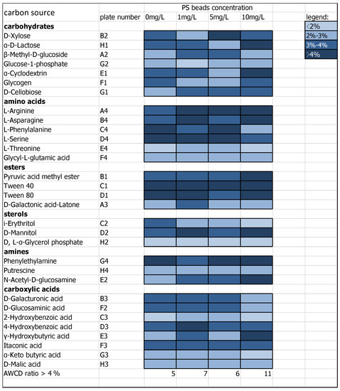 The concentration AWCD pattern can be elucidated in three possible ways. First, a high PS concentration habitat could favor a certain community of periphyton species whose preferred carbon sources are examined and shown here. These species are more physically tolerant of PS particle impairment than their counterparts, which results in the enhancement of their survival rate. Second, the vertical stratification nature of freshwater periphytons may enable inner layer microorganisms to be protected from high NP pressure environments where outer layer microorganisms such as phototrophs suffer. Therefore, the oxidative stress, membrane-penetration rate, chemical communication interference, and other adverse impacts induced by NPs could vary among the microbes inhabiting different biofilm layers [18,43]. Third, organisms jeopardized by high NP environments may die; the structures of the dead microbes can then serve as new carbon sources for adjacent microbes. In short, the cumulative effects induced from these three explanations creates a new niche in different NP concentrations, providing opportunities for propagules or spores in dormancy to germinate and, consequently, reshape the benthic community structure.