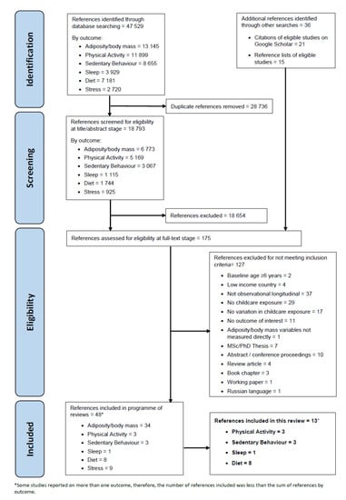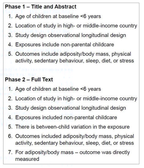 - Costa, S.; Adams, J.; Phillips, V.; Benjamin Neelon, S.E. The relationship between childcare and adiposity, body mass and obesity-related risk factors: Protocol for a systematic review of longitudinal studies. Syst. Rev. 2016, 5, 141. [Google Scholar] [CrossRef]