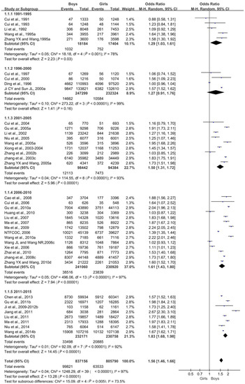 An absolute comparison of overweight boys and girls (OR) was performed, and a forest map was drawn. Overall, the difference in the prevalence of overweight was statistically significant (p < 0.05); that is, the overweight rate was related to sex, and the sex difference in the detection rate of overweight was increasing each year (Figure 2).