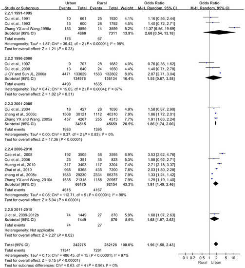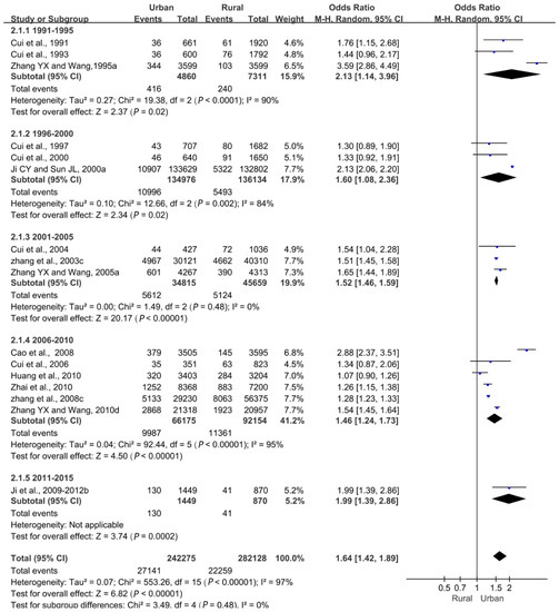 The literature was divided into five periods according to the year of investigation (1991–1995, 1996–2000, 2001–2005, 2006–2010, and 2011–2015) and compared and analyzed according to sex, age, and place of residence (urban and rural). Open-Meta (Agency for Healthcare Research & Quality, Rockville, MD, USA) was used to calculate the positive rate of overweight or obesity by time, sex, age, and residence and the 95% confidence interval (CI). The data were analyzed using Review Manager 5.1.4 (Nordic Cochrane Center, Copenhagen, Denmark), and the combined effect odds ratio (OR) value and 95% CI were calculated. For the heterogeneity test, the test level was α = 0.05. If there was no statistical heterogeneity, the fixed effects model was used; otherwise, the random effects model was used [19]. Sensitivity analysis was used to determine sample size, study quality, diagnostic criteria, geographic distribution, and whether the type of survey affected the research findings. Publication bias was assessed by inspecting funnel plots, and formal testing for funnel plot asymmetry was performed using the Begg and Egger tests, which were conducted using Stata/SE12.0 (Stata Corp., College Station, TX, USA) [20].