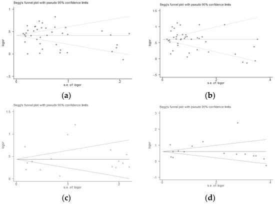 According to the included studies, Begg’s funnel plots were drawn. The Begg’s test and Egger’s test further showed that there was no publication bias in overweight (Figure 6a, Begg’s test, p = 0.328, and Egger’s test, p = 0.892; Figure 6c, Begg’s test, p = 0.392, and Egger’s test, p = 0.947) and obesity (Figure 6b, Begg’s test, p = 0.159, and Egger’s test, p = 0.976; Figure 6d, Begg’s test, p = 0.192, and Egger’s test, p = 0.930).