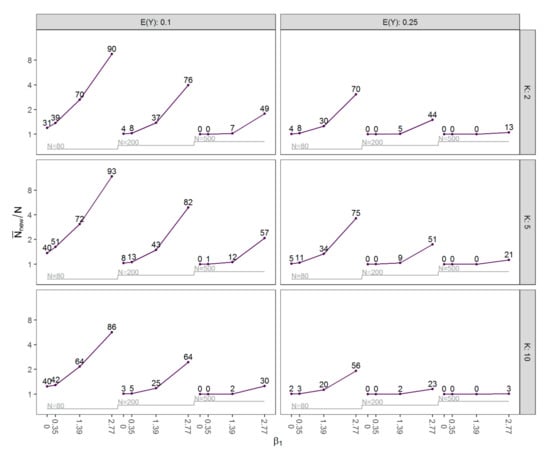 Nested loop plot of by the expected value of the number of covariates , the value of , and the sample size for all simulated scenarios. The numbers indicate the prevalence of separation (%) with sample size .