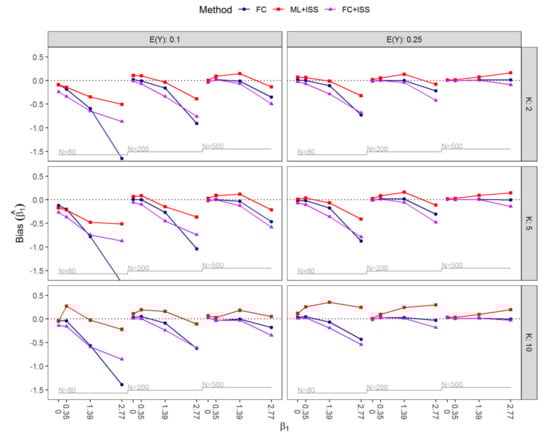 For finite sample sizes, the sampling distribution of ML regression coefficients consists of a subdistribution of finite values and a proportion of diverging estimates that can be explained as a consequence of an extreme small sample bias. The ML+ISS analysis compensates the bias away from zero of ML estimation by the bias towards zero that is induced by sampling until the extreme bias is removed. This can be exemplified by assuming that the original data set and the added observations are analyzed separately. The FC estimate obtained from the model fitted on the added observations has a strong negative bias: In the colonoscopy study, e.g., for the added observations was equal to , while the estimate in the original data was . In parallel, FC estimation can be represented by ML estimation on augmented data consisting of the original and pseudo-observations [,]. The model fitted on the pseudo observations has . As such, the ML+ISS strategy indeed results in acceptable biases but sometimes comes at the cost of highly inflated sample sizes. FC applied to data sets of (much) smaller sample sizes, by contrast, generally yields almost unbiased estimates. While the bias away from zero in ML estimation is a result of poor applicability of large-sample properties in small samples, the ISS strategy actually adds bias towards zero and so the two biases may cancel each other out. If combined with the unbiased FC strategy, however, ISS leads to a bias towards zero. When the true effect size is very large, FC can be biased towards zero [], and ISS can amplify this effect, as demonstrated in our simulation study.