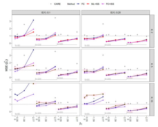Figure 3 presents the MSE of and CARE of ML+ISS compared to FC. For most scenarios, there were no considerable differences in terms of MSE of between the methods. However, ML+ISS yielded in some cases much larger sample sizes with the average sample size up to 11.8 times higher than the original and a maximum difference between and of 6424 observations. Therefore, FC was a more efficient estimator in all but four scenarios, and in these four scenarios, CARE was very close to one. Interestingly, even with sample sizes of , FC usually performed slightly better than ML+ISS. In extreme situations with the highest values of and small sample sizes of , the MSE by FC was poor in absolute terms and could only slightly be improved by ML+ISS. The improvement came at the cost of much higher sample sizes, such that FC was substantially more efficient (CARE >> 1). FC often achieved reasonably small MSE even with large proportions of separation, but it failed considerably in small sample situations () with strongest effects of and , and in all small sample situations with and covariates included in the model. In the latter situations, ML+ISS as well yielded very unstable regression coefficient estimates with an extremely large MSE. As expected, by increasing the sample size, FC+ISS most often reduced the MSE of FC. However, it also occurred that the MSE was slightly increased despite the larger sample size: In some scenarios where bias towards zero was smaller for FC+ISS than FC, the latter yielded lower MSE, and, notably, in a few scenarios, FC outperformed FC+ISS with respect to both bias and the MSE.