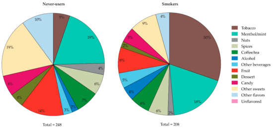 IBM statistics SPSS version 24 (IBM, Armonk, NY, USA) [54] was used for data analysis. No data were excluded. Attractiveness of product characteristics, and the e-liquid flavor categories preferred (for never-users and smokers, excluding those who selected the answer option “I don’t want to try any flavor”) and firstly and currently used (for dual and exclusive vapers) were analyzed using frequencies. Flavor preferences were presented in a pie chart as the percentage of the total number of responses.