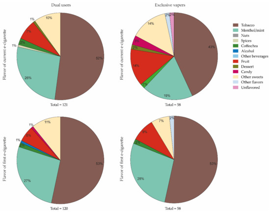 Figure 2. Flavors used on current (top) and first (bottom) e-cigarette exposure among dual (left) and exclusive vapers (right). Participants could select only one flavor category to indicate the flavor of their current and first e-cigarette used. Data are presented as percentages of the total number of responses, not of the total sample sizes.