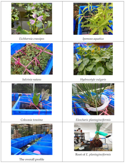 The plant species used in this study were Salvinia natans, Eleocharis plantagineiformis, Ipomoea aquatica, Hydrocotyle vulgaris, Colocasia tonoimo, Typha orientalis, Eichhornia crassipes, Dysophylla sampsonii, and Rotala indica, which were selected from more than 30 aquatic plant species based on their good growth rates. Namely, in this preliminary study, we tested over 30 aquatic plants collected from the field sewage ditch in the Pearl River Delta. After a period of indoor adaptive cultivation, we found that some aquatic plants did not grow well or grew very slowly, and then kept the fast-growing species for further research. These nine species were used in the first stage of the experiments (Table 1). They were introduced from a polluted riverside in the Pearl River Delta in Guangdong Province. Hydrocotyle vulgaris, a common invasive species that is already widely distributed in southern China, was included as a control. The plants were cultivated in a 30 L container and placed in a greenhouse for two weeks. All the selected plants were cultured in a ¼-strength modified Hoagland’s nutrient solution [22]. Water was added every three days to maintain the content. Hoagland’s nutrient solution was added once a week to maintain adequate nutrient content for plant growth.