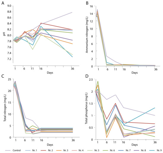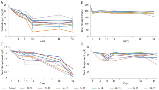 The TP content of the artificial domestic wastewater decreased in all tests to reach lower values than those of the control after 46 days (Figure 4C). The high phosphate concentration of the artificial animal farm wastewater could be decreased to a level as low as 17.3 mg/L. Combination treatments Nos. 14, 16, and 17 produced significantly lower TP concentrations than the control did (Figure 4D).