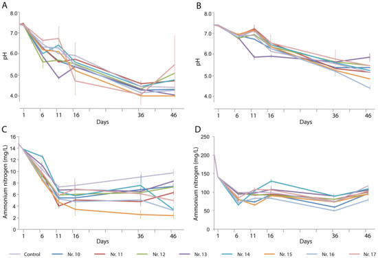 Changes over time in (A,B) pH and (C,D) NH4+-N content in (A,C) artificial domestic sewage water and (B, D) artificial animal farm wastewater in the presence of various plant species and their combinations: No. 10, Eleocharis plantagineiformis; No. 11, Hydrocotyle vulgaris; No. 12, Ipomoea aquatica; No. 13, Salvinia natans; No. 14, S. natans–E. plantagineiformis; No. 15, H. vulgaris–E. plantagineiformis; No. 16, I. aquatica–E. plantagineiformis; No. 17, S. natans–E. plantagineiformis–H. vulgaris. Mean results of three replicate experiments are shown, with standard errors of >5%. For clarity, standard errors of pH results are only shown for maximum and minimum values per time point.