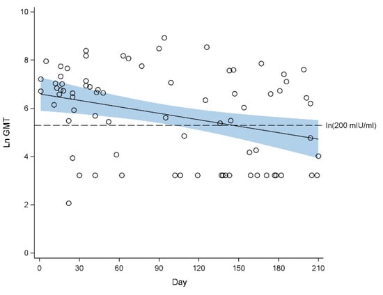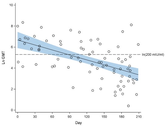 In order to assess whether infants maintained seropositive levels of measles antibodies up to the age of 8 months, a linear regression line was used to show the trend in the scatterplot of log-transformed GMT against age in days for each of the two years. The 95% confidence intervals (CI) of the regression line were calculated to assess whether the age-specific GMTs were significantly below the seropositivity threshold. To compare the 2009 and 2013 measles GMTs at different ages, picked-points analysis was used to assess the significance of the difference in mean GMT at 1, 3, 5, and 7 months of age [15,16]. p-values < 0.05 were considered to be statistically significant. All data analysis was done using SAS software, Version 9.4 (SAS Institute, Cary, NC, USA).