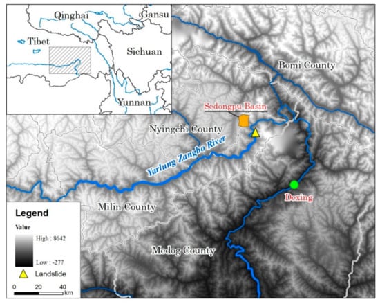 Landslides and damming the Yarlung Zangbo River at Milin County in Tibet, are two typical cases that occurred on 17 and 29 October 2018. In the Sedongpu Basin, two landslides blocked the river within 13 days, and the river burst its banks after two days (Figure 1). The dammed lake constitutes a water body with a certain amount of solid matter blocked by mountain river valleys or rivers. In general, a dammed lake refers to a naturally formed water body. These dammed lakes are widely distributed throughout the world, especially in mountain valleys where earthquakes occur frequently []. There are many barrier lakes at different scales in China’s mountainous areas, and breaches from some of these dammed lakes have resulted in serious environmental disturbances. China’s barrier lakes are mainly distributed in alpine valleys and alpine regions, and some large earthquakes have resulted in the failure of these barrier lakes [,,,]. In particular, high mountain and canyon areas with steep and rugged terrain, which experience new tectonic movements, including earthquakes, are active, such that landslides and mudslides have become more frequent []. Once large-scale landslides and mudslides occur, blockage of the main river and formation of a barrier lake occurs. Frigid and high-altitude areas tend to be the areas where modern glaciers and glacial lakes develop, and many moraine-dam lakes are known. Between 1949 and 1994, there were 78 incidents of landslides which blocked rivers in mainland China, mainly in the southwestern mountains of Sichuan, Yunnan, and Tibet. There was also a small number of such occurrences in Hubei, Guizhou, Hunan, Shaanxi, Gansu, Qinghai, and Xinjiang [,,]. In 2008, the Wenchuan earthquake gave rise to the formation of 256 barrier lakes, which were mainly distributed along the main rupture zone of the earthquake and 85.6% of the dammed lakes were distributed in the three major fault zones of Longmenshan and within 10 km of the fault [].
