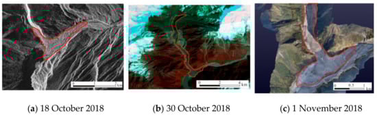 Comparison of remote sensing imagery on 26, 27, and 30 October 2017 for avalanche deposits in the Sedongpu Basin.