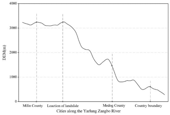 The Yarlung Zangbo River barrier lake was caused by landslides and mudslides blocking the river. The dammed lakes occurred in an alpine valley area where the terrain is steep. The height difference in the terrain is higher than 1000 m and the potential energy is very large (Figure 3). It is relatively easy for a high-level landslide to occur in this region. The landslide can slide for several km or even 10 km, forming a dammed lake in the river.