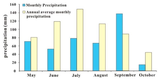 The water storage capacity of the two barrier lakes reached 100 million m3 in just several to tens of hours, and the growth rate was rapid, mainly due to the large river flow in the area where the lake was affected. According to the precipitation data of the meteorological department, the recent precipitation in the southeastern part of the Qinghai-Tibet Plateau was significantly higher than that in the same period of the previous year, and in some areas it was four times greater. From May to October 2018, the precipitation at Milin was 422.9 mm, which was 28.7% less than that for a typical year (593.1 mm). Since May, the precipitation in May–August and October was less than 100 mm; among these months, the precipitation in June, July, and August was 40–50% less than normal. However, in September, more precipitation occurred, in excess of 50% of normal levels (Figure 4).