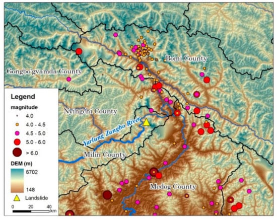 There have been 22 earthquakes of magnitude 3 or higher since 2012 in the vicinity of the Sedongpu Basin (Figure 5). On 18 November 2017, the epicenter of the Milin 6.9 earthquake was about 10 km away from the mouth of the Sedongpu Basin and the focal depth was 8 km []. This earthquake to some extent destroyed the stability of the glacier structure, the accumulations in the valleys, and the moraine.