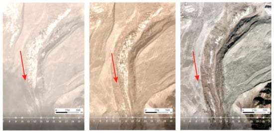 There are many ice crevasses in the middle of the glaciers and the ends of the glaciers are covered by moraine. The glaciers over the entire valley melted considerably. In 1970, the glaciers of the Sedongpu Basin were an integrated whole. At present, the glaciers are divided into many branches due to strong ablation. The Sedongpu Basin is about 2100 m long and 115 m wide []. According to a comparative analysis of remote sensing images for 26, 27, and 30 October 2017 glacial meltwater was the main cause of this debris flow (Figure 6).