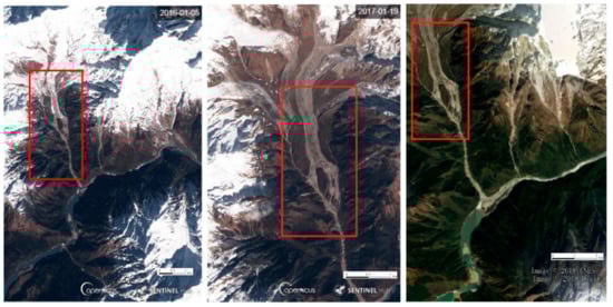 Comparison of remote sensing images before and after the collapse of the barrier lake.