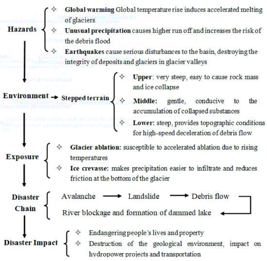 The high mountain hazard chain is a catastrophic phenomenon of one mountain hazard triggering other mountain hazards under the action of inducing disaster factors. It often consists of two or more high mountain hazards such as debris flow, flash flood, landslide, collapse, ice avalanche, snow avalanche, and soil erosion [,,,]. The high mountain hazard chain is the result of mass transfer and energy conversion of mountain hazards []. Although there are some studies on mountain disaster chains, scholars have also explored some prevention and control methods, such as chain-cutting disaster mitigation from gestation source, and the prevention and control of disasters in the chain [,].